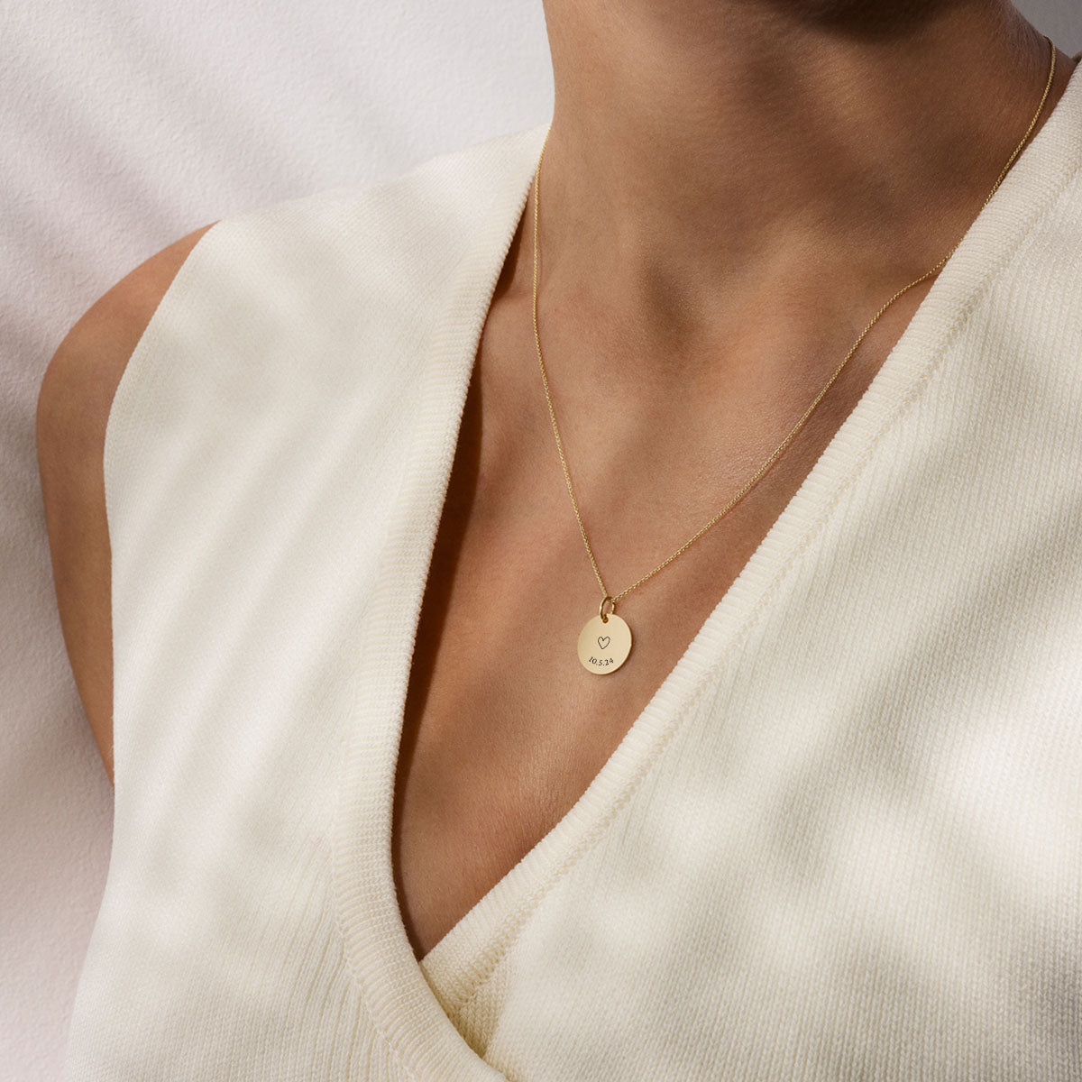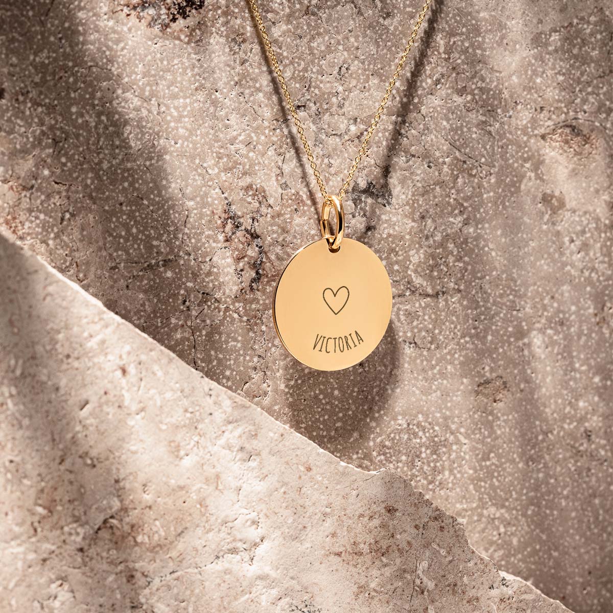 Ein Schmuckstück mit persönlicher Bedeutung! Unser runder Anhänger (14k vergoldet) wird nach deinen Wünschen graviert – wähle ein Symbol aus einer Vielzahl von Motiven und kombiniere es mit einem Namen oder einem Datum.