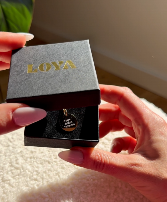 Bei LOYA wird dein Schmuckstück mit viel Liebe graviert und anschließen sicher in unserer schönen Schachtel für dich verpackt. Dazu erhältst du ein Poliertuch, damit dein Schmuckstück lange glänzt.