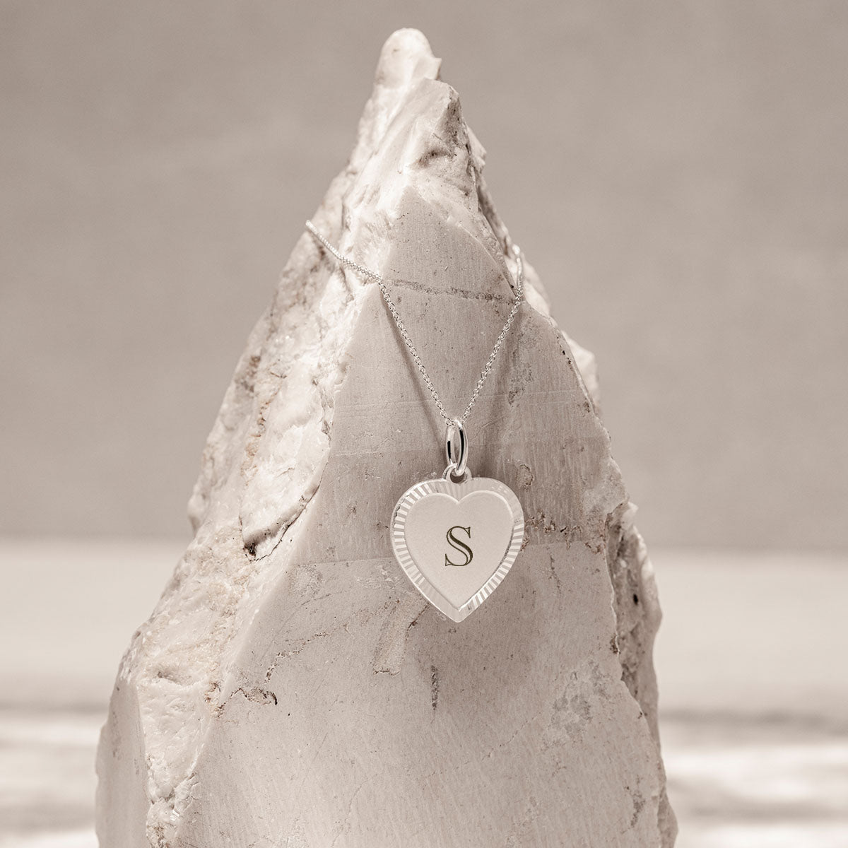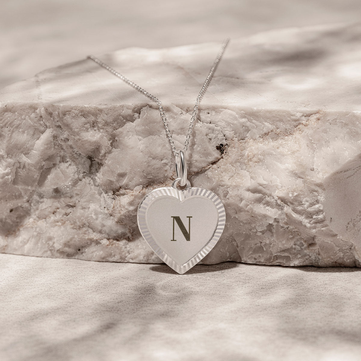 Ein romantischer Herzanhänger im Vintage-Stil aus 925 Sterling Silber, mit edler teilmatter Oberfläche und individueller Monogramm-Gravur für eine persönliche Note.